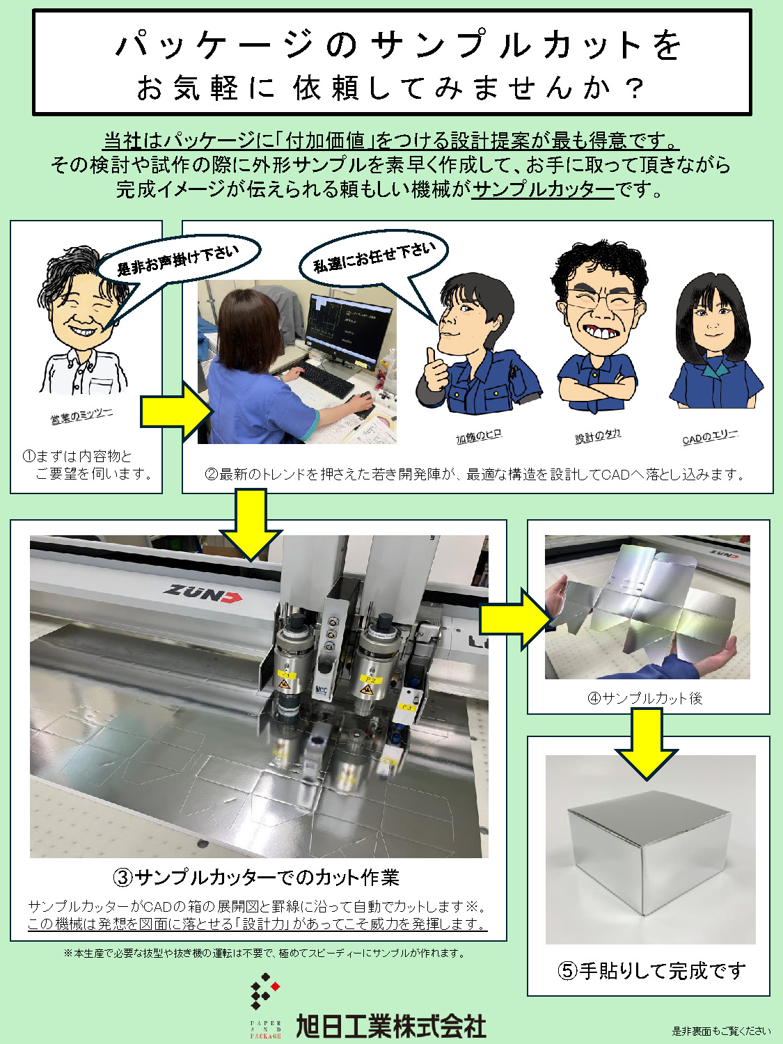 サンプルカッターはCADで図面を引いた通りにその場で箱の展開図をサクッと切ってくれる機械で、お客様へ素早く完成イメージが伝えられます。